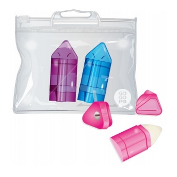 Το σετ αυτό, περιλαμβάνει 3 γόμες-ξύστρες σε ροζ, μωβ και μπλε χρώμα.