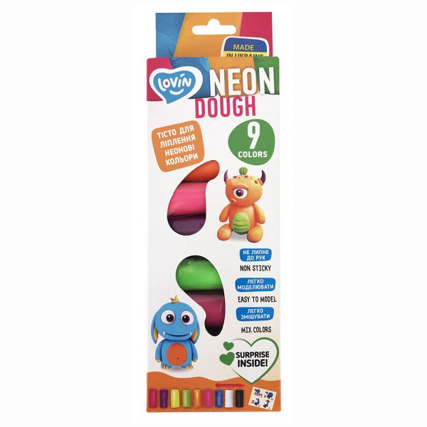 Περιεχόμενα συσκευασίας: 9 neon χρώματα πλαστελίνης, εργαλείο μοντελοποίησης, οδηγίες με ιδέες για μοντελοποίηση, αυτοκόλλητα έκπληξη.