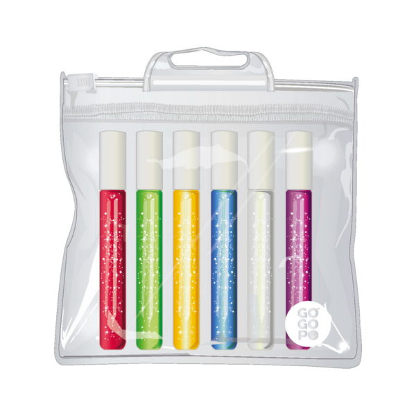 Το σετ περιλαμβάνει κόλλα σε 6 διαφορετικά χρώματα: ροζ, πράσινο, κίτρινο, μπλε, λευκό και μοβ.