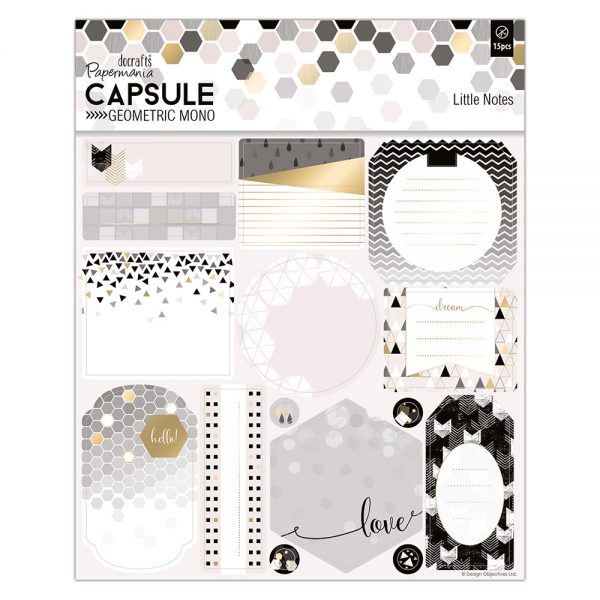 Ένα όμορφο σετ με 15 προ-κομμένες καρτούλες, σε διάφορα σχήματα και σχέδια από τη συλλογή Capsule Geometric Mono, που είναι γεμάτη γεωμετρικά σχέδια, μοτίβα και χρυσοτυπία, για να γράφετε όμορφα σημειώματα!
