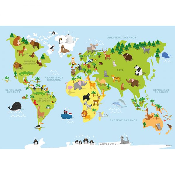Διακοσμήστε τον χώρο σας με αυτή την εντυπωσιακή αφίσα που απεικονίζει τον παγκόσμιο χάρτη, με χαρακτηριστικά ζώα σε κάθε Ήπειρο!