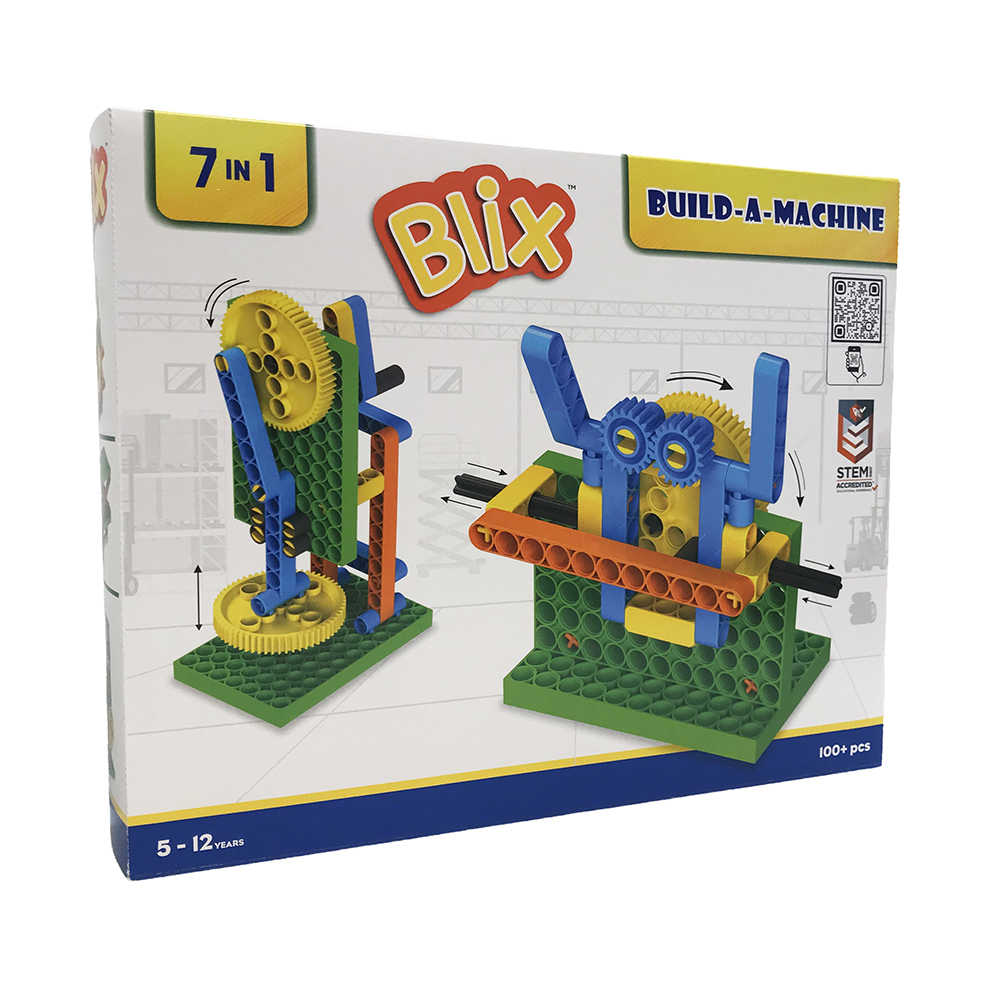 Με το Blix Σετ Κατασκευής με Τουβλάκια 100+ τμχ Build-A-Machine 7 σε 1, μπαίνετε στον συναρπαστικό κόσμο της τεχνολογίας και της μηχανικής. Αυτό το σετ κατασκευών 7-σε-1 φέρνει πραγματικά μηχανικά συστήματα στα χέρια των παιδιών. Μπορούν να κατασκευάσουν και να εξερευνήσουν έναν μηχανισμό Scotch Yoke, ένα ψαλιδωτό ανυψωτικό, έναν ανυψωτήρα με σύστημα οδοντωτού κανόνα και γραναζιού (rack-and-pinion), μια πρέσα ισχύος, έναν τροχό λούνα παρκ (Ferris wheel) και πολλά ακόμη.