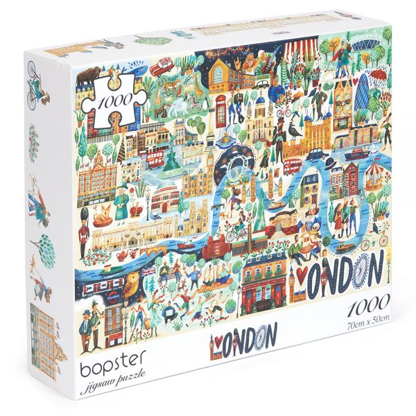 Το Εικονογραφημένο Παζλ 1000pcs Λονδίνο, απεικονίζει γνωστά ορόσημα και χαρακτηριστικά στοιχεία της πρωτεύουσας, με μια υπέροχη χρυσή, κόκκινη και πράσινη χρωματική παλέτα.