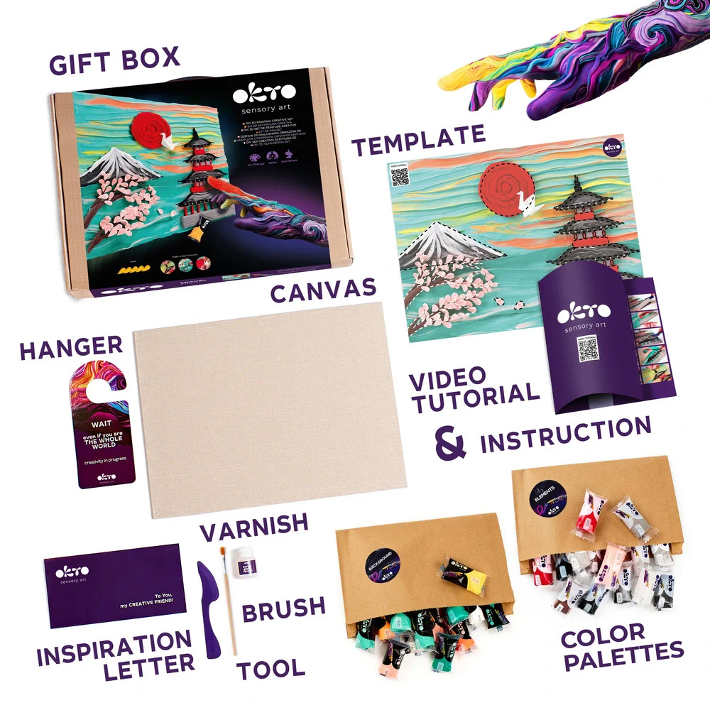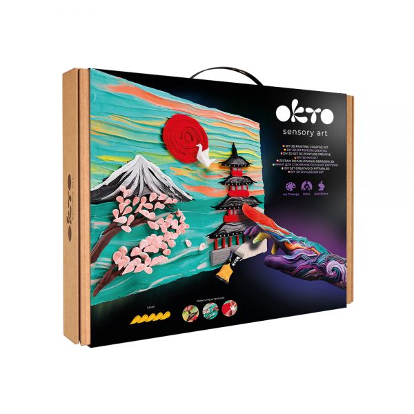 Μοναδικό σετ για να αναπτύξετε τη δημιουργικότητά σας, αλλά και για να διακοσμήσετε τον χώρο σας ή να το προσφέρετε σαν δώρο. Δημιουργήστε ένα εντυπωσιακό τρισδιάστατο αριστούργημα που ενσαρκώνει το πνεύμα της Ιαπωνίας, απλώνοντας και σμιλεύοντας με τα δάχτυλά σας τον πηλό πάνω στον καμβά. Συνθέστε μία μαγική εικόνα με το Όρος Φούτζι, μία ανθισμένη κερασιά, μία παγόδα και ένα πουλί γερανό. Αυτή η δραστηριότητα σίγουρα θα σας ενθουσιάσει, αλλά και θα σας χαλαρώσει, αφού μπορεί να βοηθήσει να ξεφύγετε από την καθημερινή ρουτίνα και να απαλλαγείτε από το άγχος!
