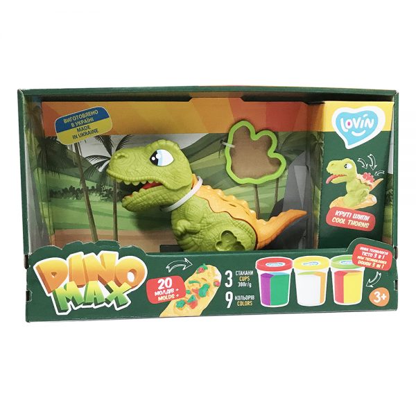 Ο πλαστικός δεινόσαυρος πιέζει τη ζύμη με αστείους τρόπους, κάνοντας το παιχνίδι των παιδιών πραγματικά συναρπαστικό! 20 θεματικά καλούπια βρίσκονται στον ίδιο τον δεινόσαυρο, αλλά και στη βάση του. Πιέστε τη ζύμη, αφήστε ίχνη, ολοκληρώστε το παιχνίδι με γλυπτά στοιχεία και βυθιστείτε στον κόσμο των περιπετειών με τον Dino Max!