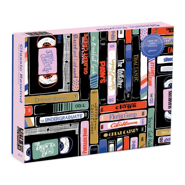 Το παζλ 1000 κομματιών, Classic Rewind, από την Galison, παρουσιάζει μια εικονογράφηση από την Bethany Robertson, με χιουμοριστικούς τίτλους ταινιών, σε κασέτες VHS.