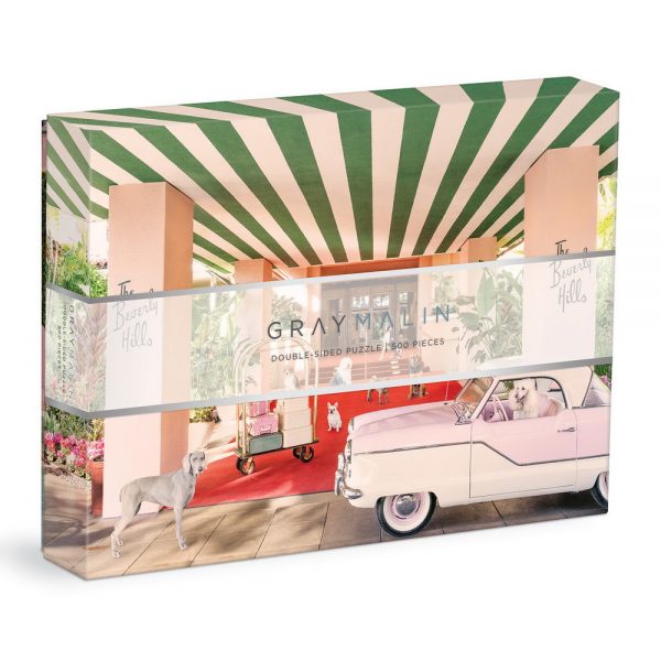 Αυτό το παζλ 500 τεμαχίων διπλής όψης, διαθέτει δύο εικόνες από την παιχνιδιάρικη σειρά του Gray, Dogs at The Beverly Hills Hotel.